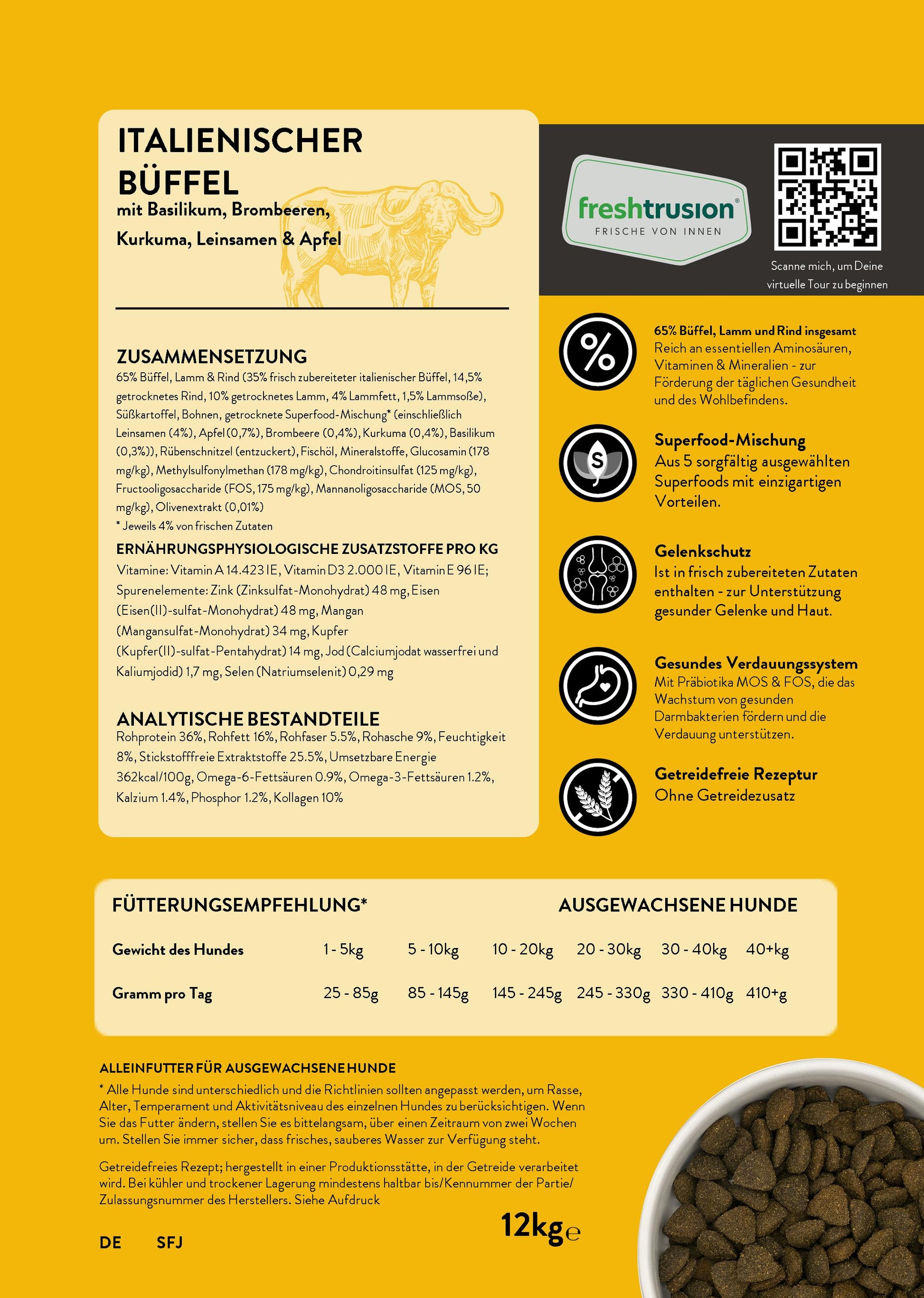 Transparente Inhaltsstoffe: Bei uns wissen Sie genau, was in den Napf kommt. Wir sind stolz darauf, zu 100% transparent über unsere Inhaltsstoffe zu sein. Auf jeder Packung finden Sie einen QR-Code, der Ihnen Einblicke in die Herkunft und Haltung der Tiere gibt, deren Fleisch wir verwenden. Vertrauen Sie auf Qualität – für das Wohl Ihres Hundes!