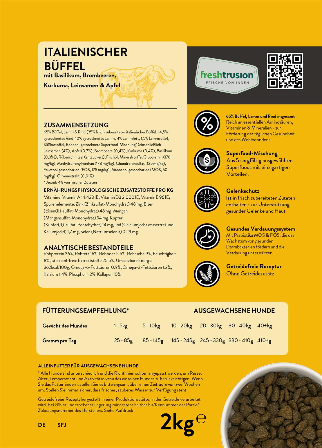 Transparente Inhaltsstoffe: Bei uns wissen Sie genau, was in den Napf kommt. Wir sind stolz darauf, zu 100% transparent über unsere Inhaltsstoffe zu sein. Auf jeder Packung finden Sie einen QR-Code, der Ihnen Einblicke in die Herkunft und Haltung der Tiere gibt, deren Fleisch wir verwenden. Vertrauen Sie auf Qualität – für das Wohl Ihres Hundes!