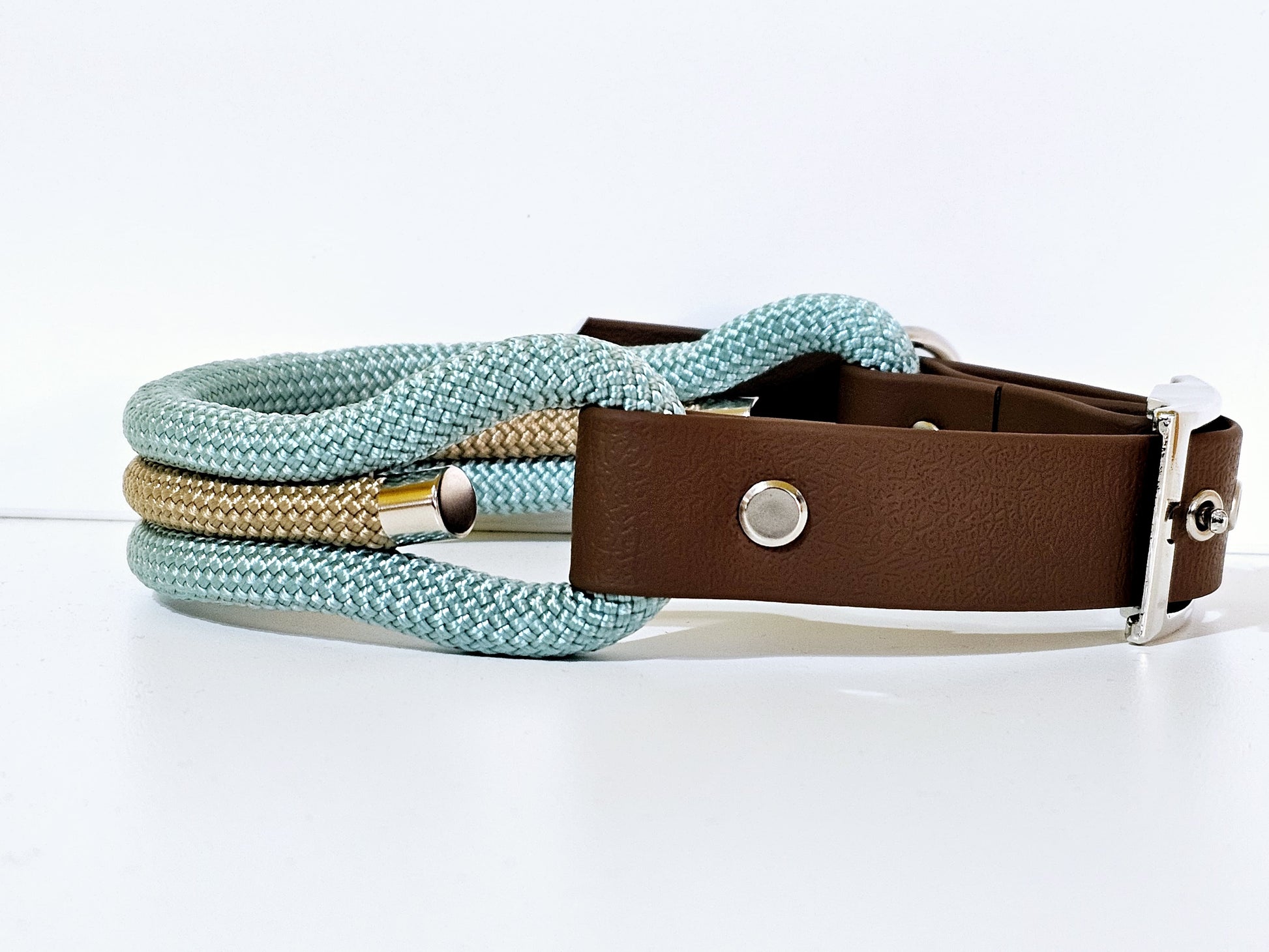Tau Premium Halsband TRIO - Biothane Verschluss Stück | 10mm / 25 mm | silber / türkis / bege