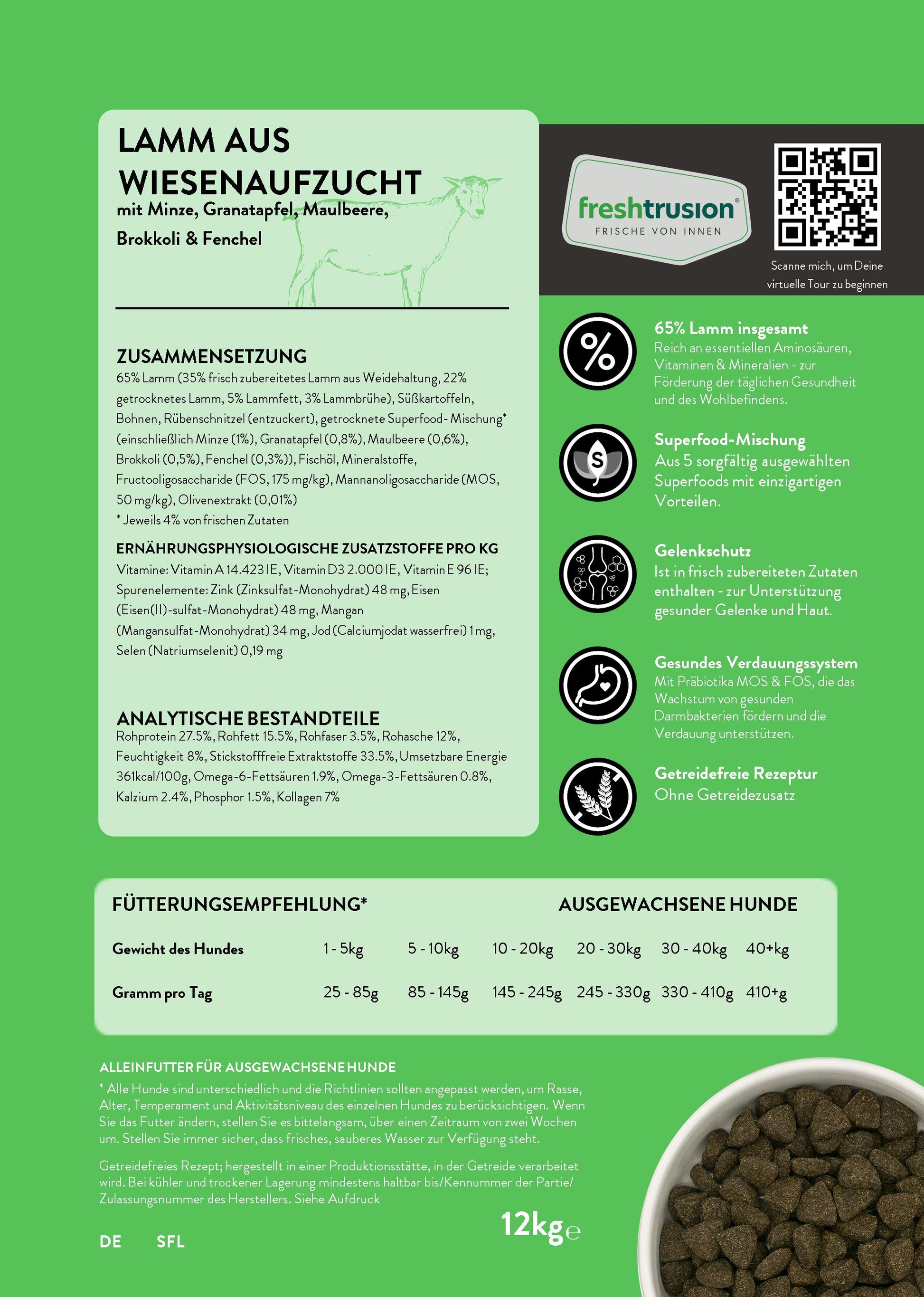 Transparente Inhaltsstoffe: Bei uns wissen Sie genau, was in den Napf kommt. Wir sind stolz darauf, zu 100% transparent über unsere Inhaltsstoffe zu sein. Auf jeder Packung finden Sie einen QR-Code, der Ihnen Einblicke in die Herkunft und Haltung der Tiere gibt, deren Fleisch wir verwenden. Vertrauen Sie auf Qualität – für das Wohl Ihres Hundes!