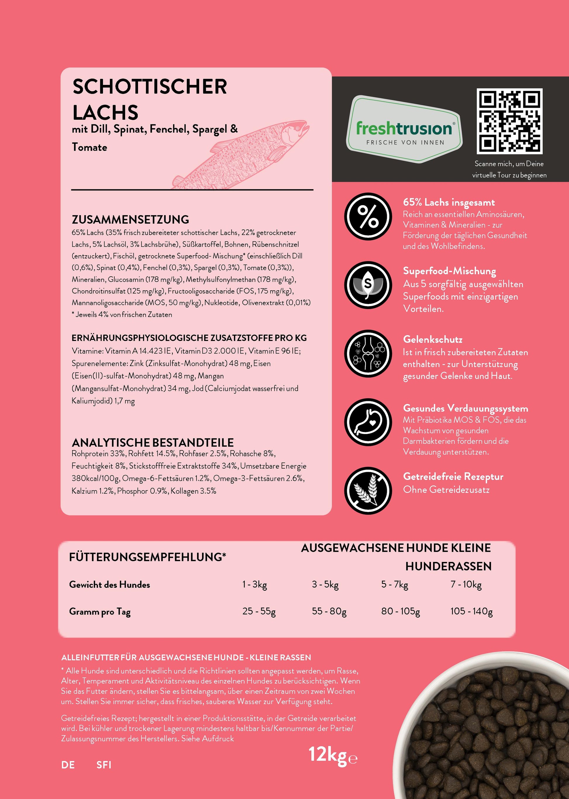 Transparente Inhaltsstoffe: Bei uns wissen Sie genau, was in den Napf kommt. Wir sind stolz darauf, zu 100% transparent über unsere Inhaltsstoffe zu sein. Auf jeder Packung finden Sie einen QR-Code, der Ihnen Einblicke in die Herkunft und Haltung der Tiere gibt, deren Fleisch wir verwenden. Vertrauen Sie auf Qualität – für das Wohl Ihres Hundes!